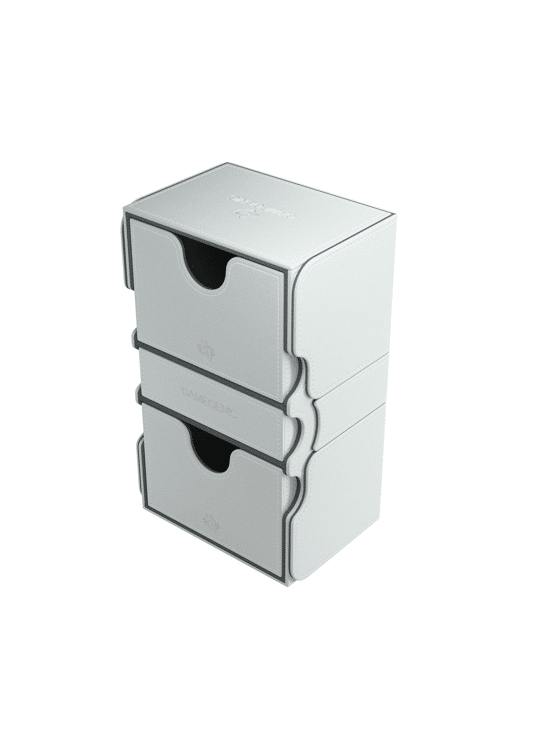 Grote, robuuste en aanpasbare witte deckbox - met twee uitneembare kaartvakken - die geschikt is voor maximaal 200 kaarten met dubbele sleeves.
